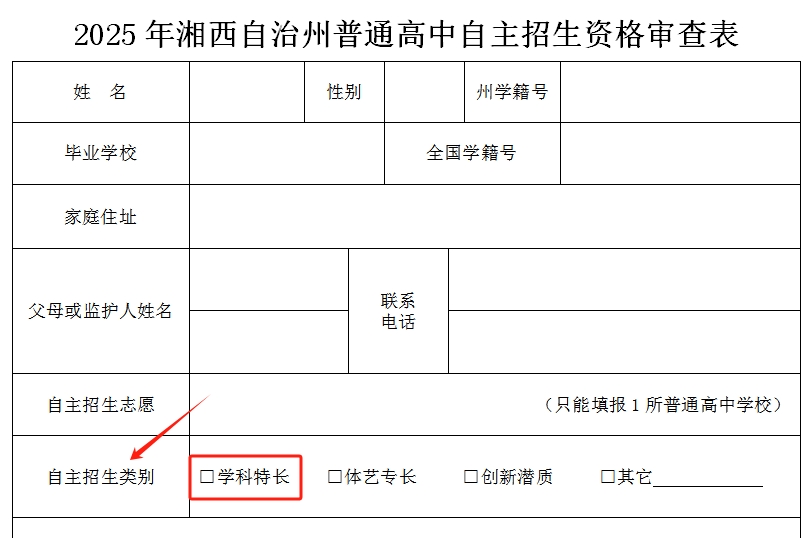 凡报考我校学科特长的学生须如实填写《2025年湘西自治州普通高中自主招生资格审查表》,然后上交吉首市第一中学教务处(勤正楼209室)。截止时间:6月10日17:00