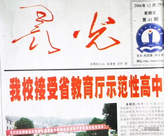 (2006年11月,时任吉首市一中校长的我,带领学校接受了省教育厅示范性高中专家组的检查。这期校报《晨光》二字是宋老师题写的)