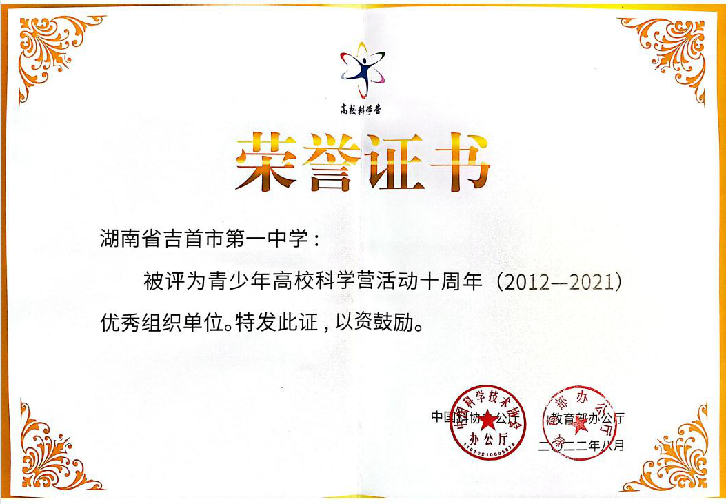 日前,中国科协公布了青少年高校科学营十周年(2012-2021年)优秀组织单位和优秀科技工作者评选结果,吉首市一中是湘西自治州唯一一所获此殊荣的高中学校。