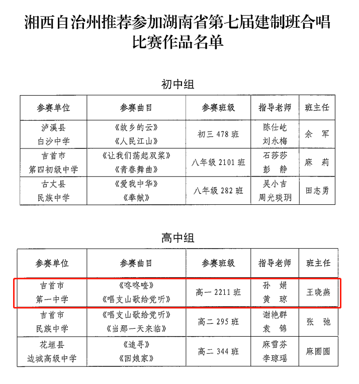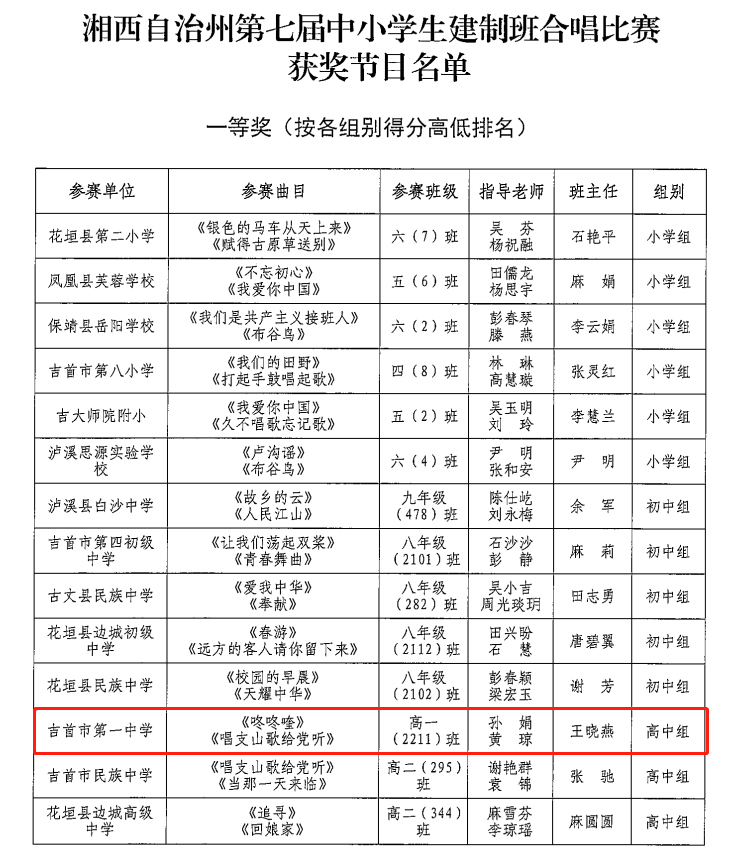 在刚刚结束的湘西自治州第七届中小学建制班合唱比赛中,我校2211班合唱节目《咚咚喹》《唱支山歌给党听》荣获高中组一等奖(第一名),并被推荐参加湖南省第七届建制班合唱比赛。我校教师孙娟、黄琼被评为湘西自治州第七届中小学建制班合唱比赛优秀指导教师,王晓燕老师被评为优秀班主任。